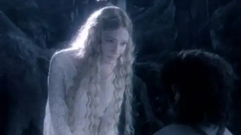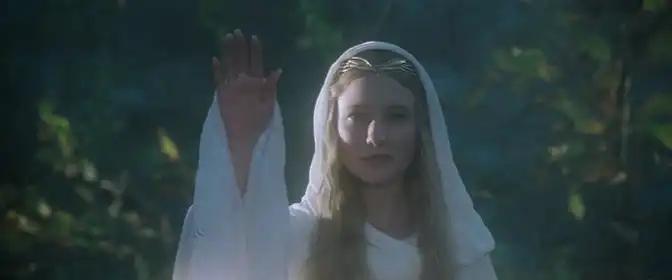 После Мории оставшиеся члены братства находят утешение в Лотлориэне — волшебном лесу и святилище эльфов под властью Галадриэль. Визуальная тональность здесь меняется на золотистую и туманную, звучение музыки Ховарда Шора подчеркнуто лирично. Галадриэль предлагает Фродо взглянуть в зеркало, показывающее вероятные пути будущего, и дарит каждому члену братства символический подарок, который в дальнейшем окажется значимым. Галадриэль и Эльронд воплощают в фильме идею вечного сохранения и мудрого взгляда вне времени, их действия свидетельствуют о том, что даже в мире магии существует цена за вмешательство.
